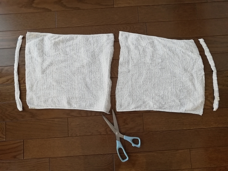 1.フェイスタオルをこのよう半分にカットし、端も切り落とします。